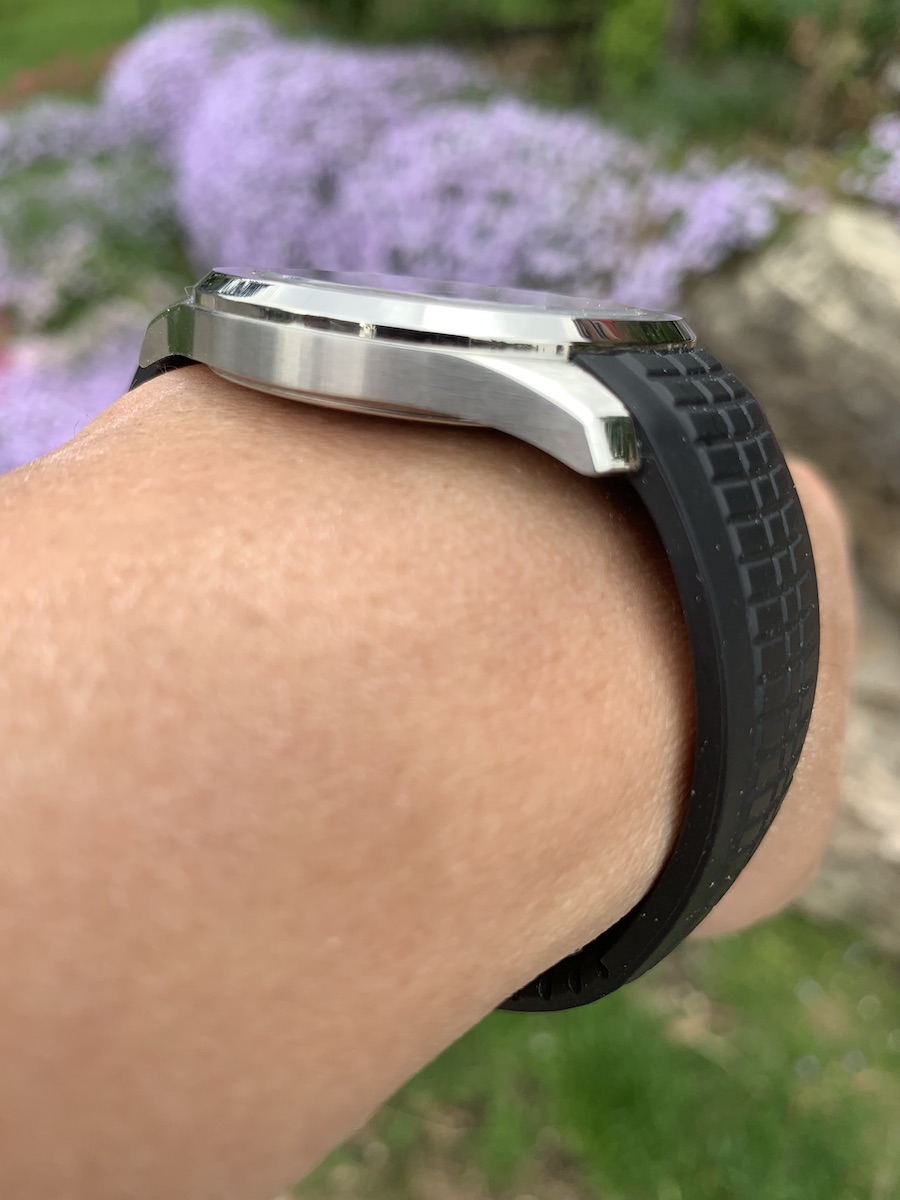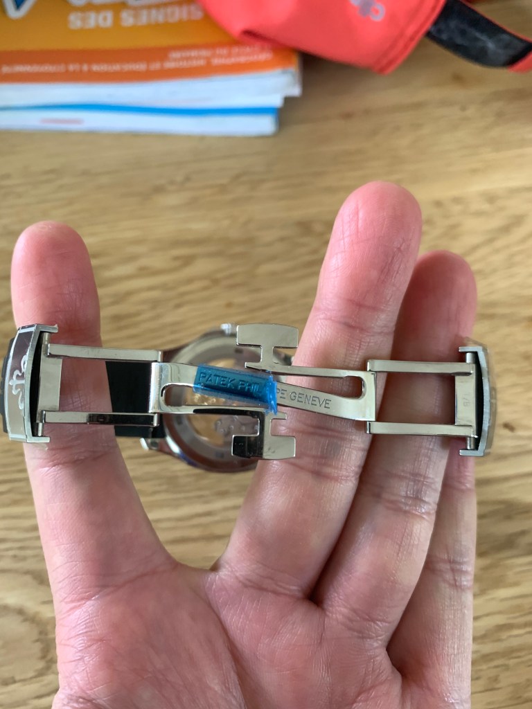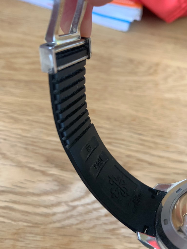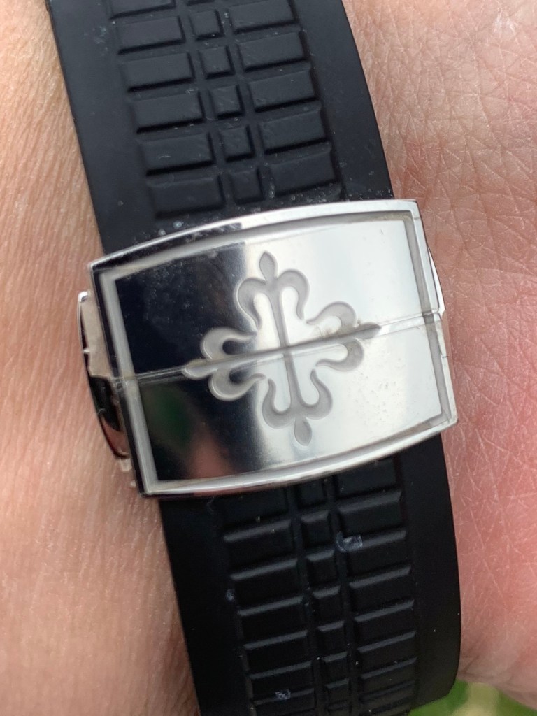 The bracelet is made of very light composite rubber polymer, what Patek labels as “tropical” presumably referring to temperature regulation. The composite rubber is supple enough to conform to the contour of my wrist but with enough rigidity so as to not to slide up and down. It is very comfortable and most times feels non existent compared to metal bracelets. Sizing the bracelet requires manually cutting along the grooves in order to attach the pins on the clasp. I had mine sized loosely for added breathability and to have the flexibility to cut more if necessary. Once cut though, enlarging and finely adjusting the bracelet is impossible compared to the Rolex easy link oysterclasp fine adjustment. Wearing it in hot summer conditions does accumulate sweat but not as much heat as metal bracelets. In order to circumvent and attenuate the sweat and heat buildup, I find that wearing it loosely helps somewhat but it is unavoidable. However, it is still more comfortable than a metal bracelet because it is lighter and more breathable.