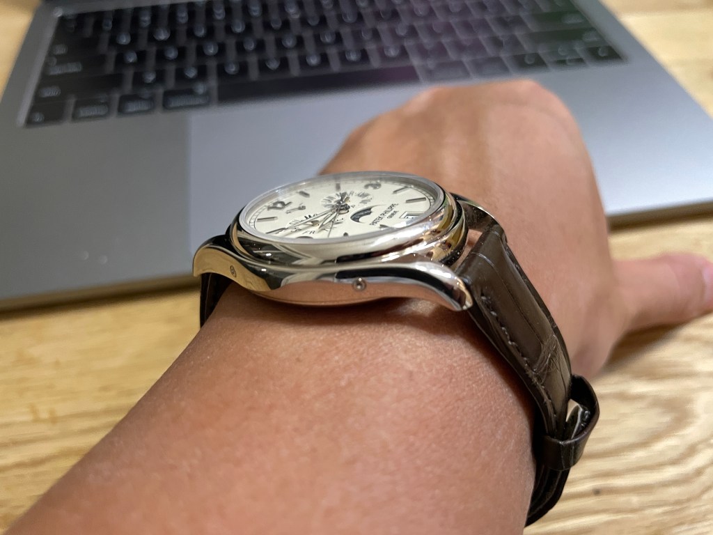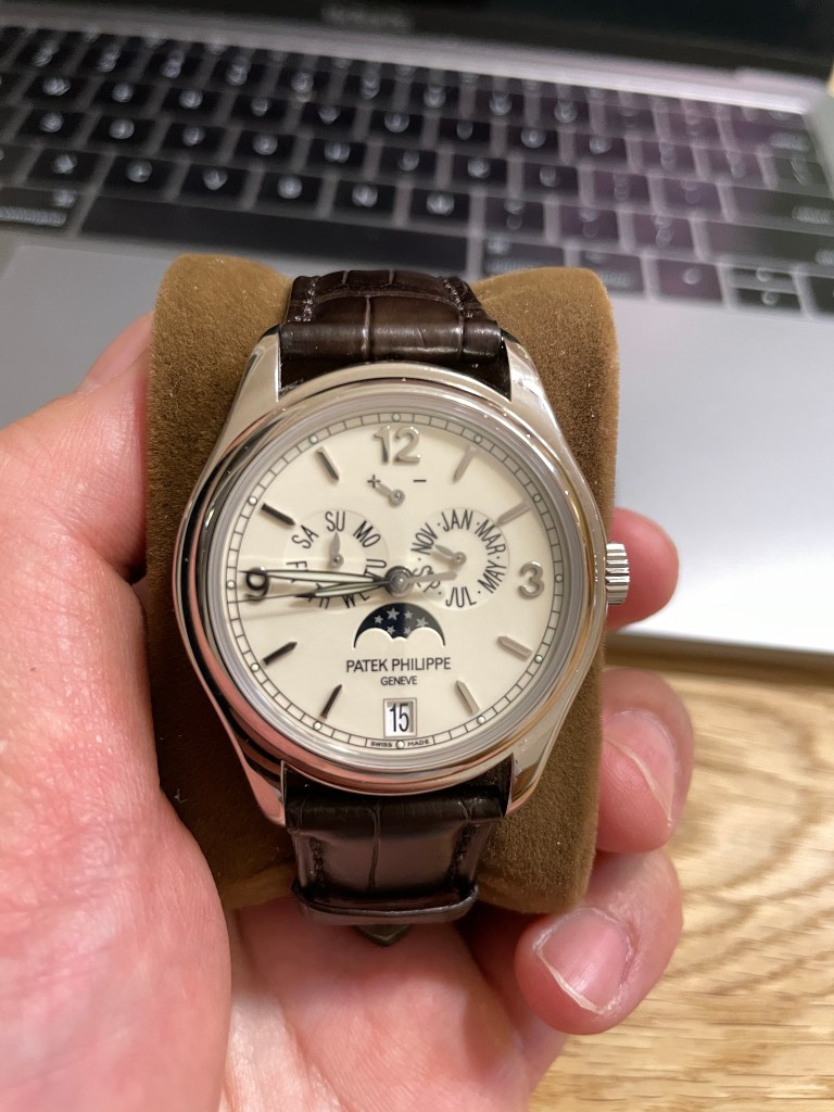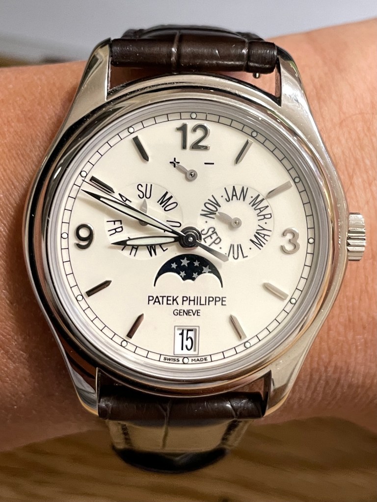Back to relevance here, for a white gold complicated Patek watch, it wears surprisingly light comfortable and thin. While I am in awe of how Patek watchmakers can fit such a complicated movement in such a compact case, they better me by fitting even more complicated perpetual calendars in even more compact and thinner cases, i.e: the 3940 and 5940 models.