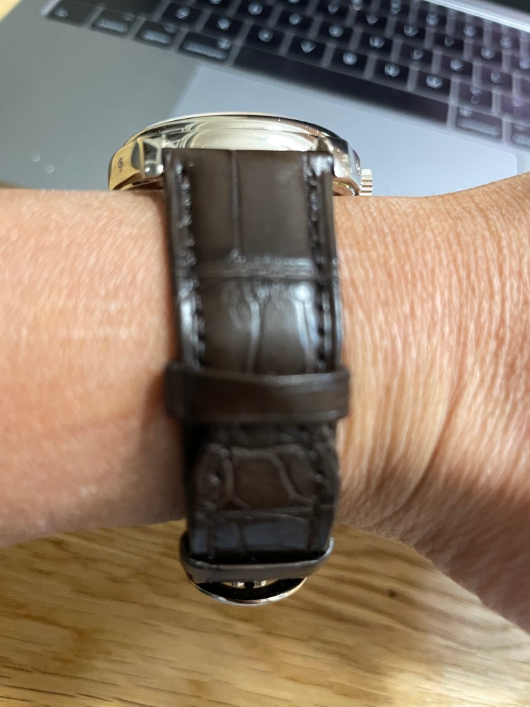 One would think that a white gold watch with so many complications would wear thick and heavy but with the factory alligator strap and the counterbalance factory white gold Calatrava cross deployant clasp, it wears very light and compact. In fact so much so the I use it as an everyday wearer. Purists have warned me not to wear it everyday because it is strictly a dress watch and not a sports watch but I disagree. Because of its comfort and annual calendar complication it should be worn everyday otherwise why have such a complication? The whole point of wearing an annual calendar is to avoid the inconvenience of having to change the date at the end of every 30 day month. Now imagine if I owned a perpetual calendar I would wear it everyday and never have to change the date.