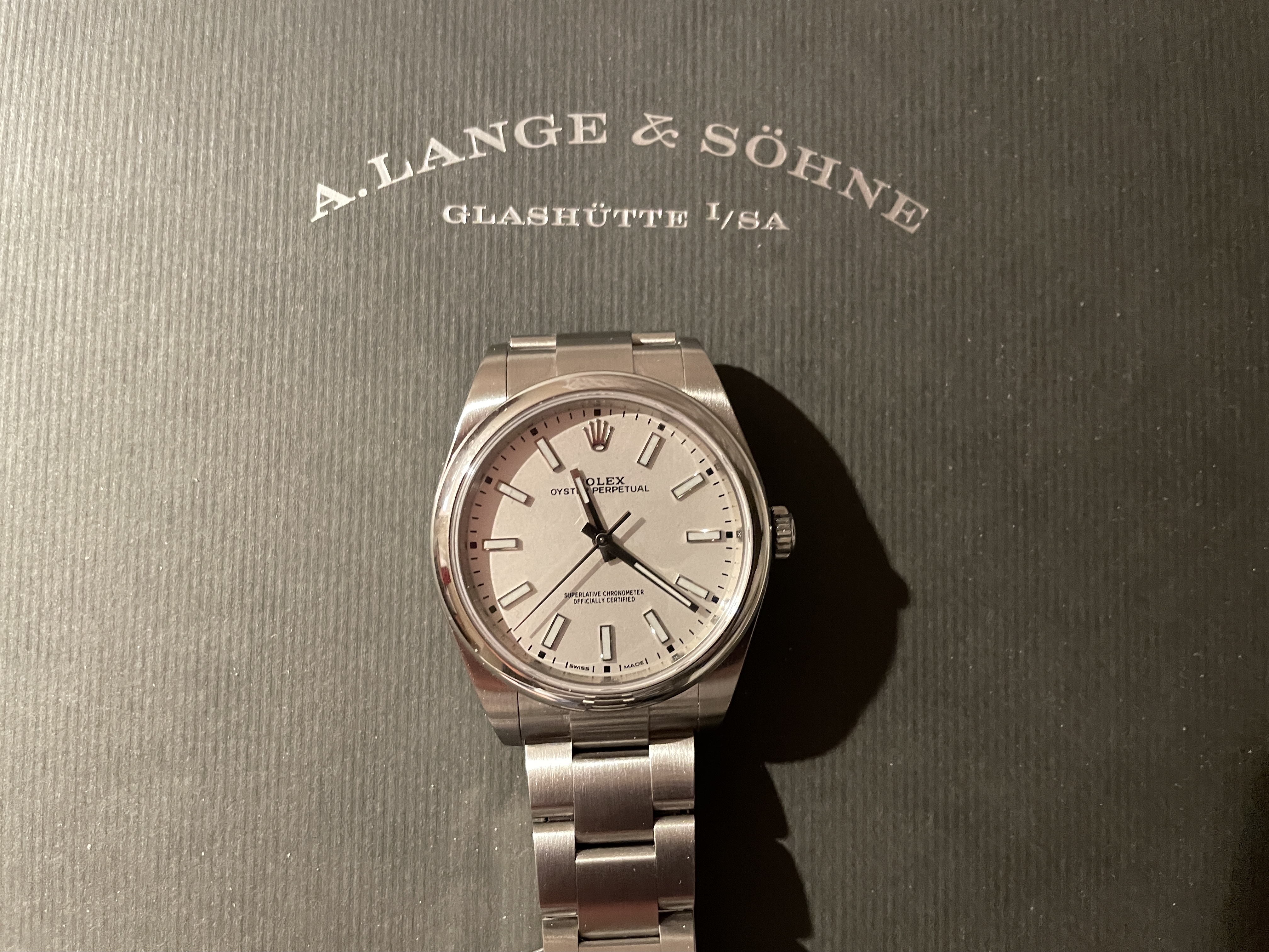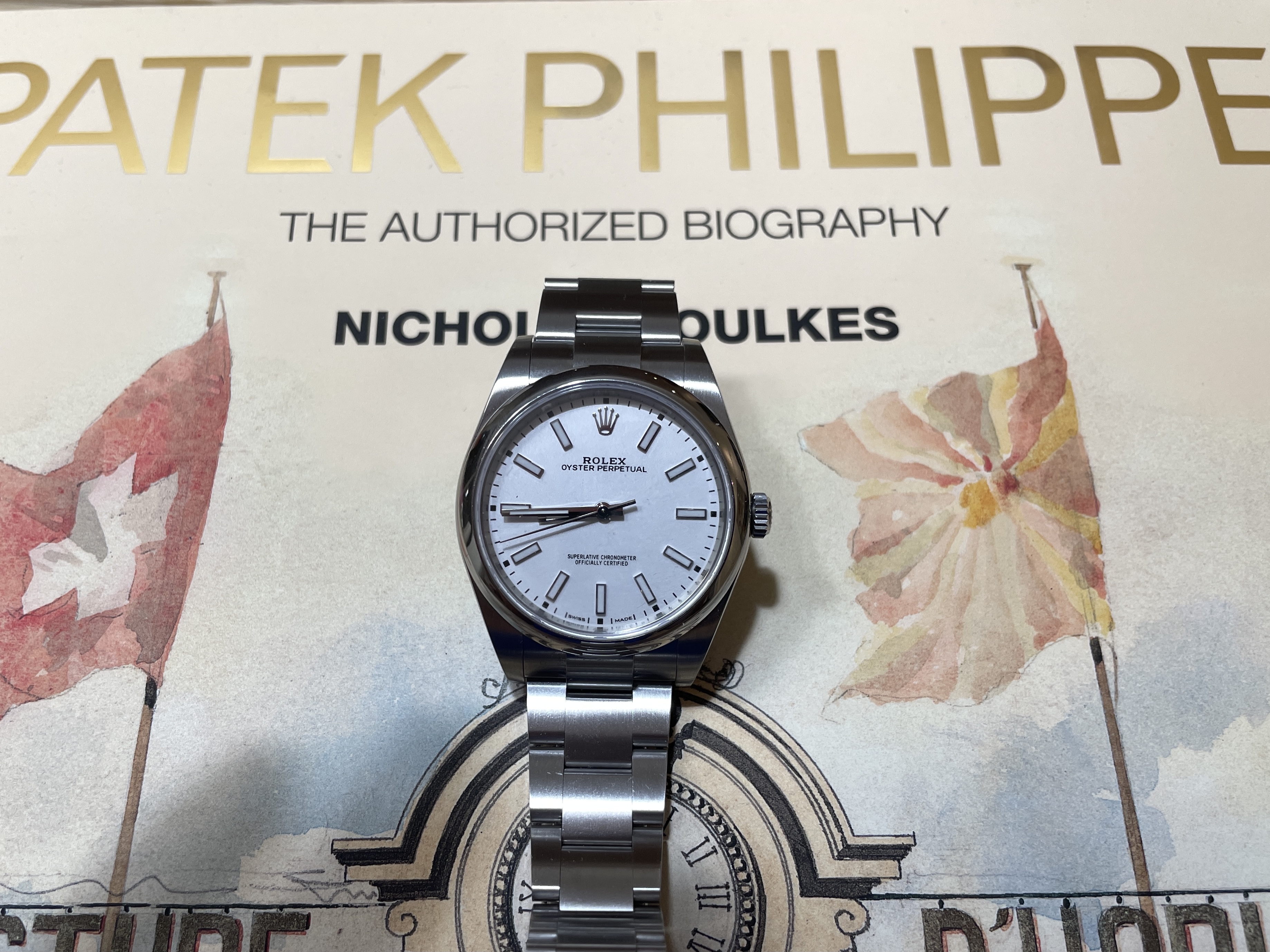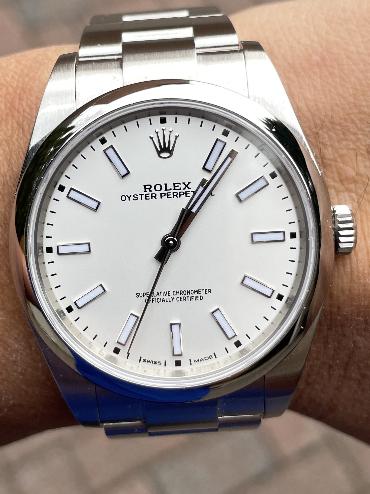 I had never put my name down on the list at an AD for this watch even though I wanted it because I thought it wasn’t as desired as the other Rolex steel sports models and would not be as difficult to obtain, so no real rush. I couldn’t have been more wrong because as of Sept 1, 2020, of course, Rolex discontinued all 39mm OP models and introduced the multi-coloured 41mm models with the new 3230 70 hr movement. Had they introduced the new OP 41 with a white dial, I would not have felt such a sense of urgency since I could have a chance to obtain a white 41. But then I pondered about whether I really wanted to wear a larger 41 mm OP and even though I had never tried an OP 41 on the wrist, I decided that I would prefer to wear a 39mm OP and specifically the white dial.