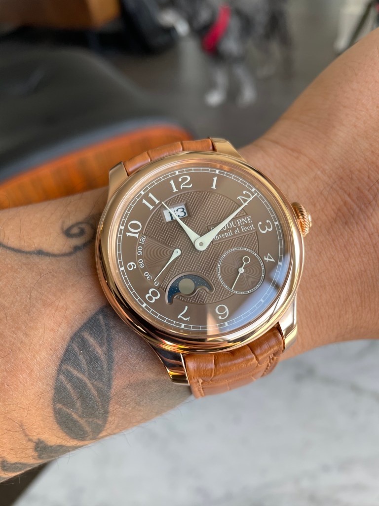 What really irks me about major or minor watch companies is the omission of a hugely important specification, the mass of a watch. It’s almost impossible to find the mass of most watches on the company’s website or elsewhere. Some select websites will indicate the mass of a certain watch because they have actually put the watch on a scale. It is a glaring omission on most watch websites if not all which indicates that this spec is just not important enough to mention. But to me, this is one highly important specification that will determine whether or not I will purchase the watch. Wearability is extremely important to my decision and I believe many others feel the same. Check Rolex, no, Patek Philippe, no, Audemars Piguet, no, A. Lange and Sohne, no. Surely an independent brand like F.P. Journe would want to display their mass to dare to be different from the crowd. No. I haven’t found any watch company that displays any mass anywhere on their website although if anyone would start a trend, it would be F.P. He is avant-garde enough to pioneer such a detail just like he manufactures his timepieces. By the way, I really admire that guy. I classify him up there with Newton, Riemann, Gauss. I am chasing a Journe piece and anyone who wants to appreciate otherworldly horology must essentially wear a Journe.